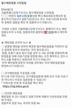 초등학교 6학년 생일이되면 보건소에서 필수예방접종 사전알림이 문자로 발송됩니다.